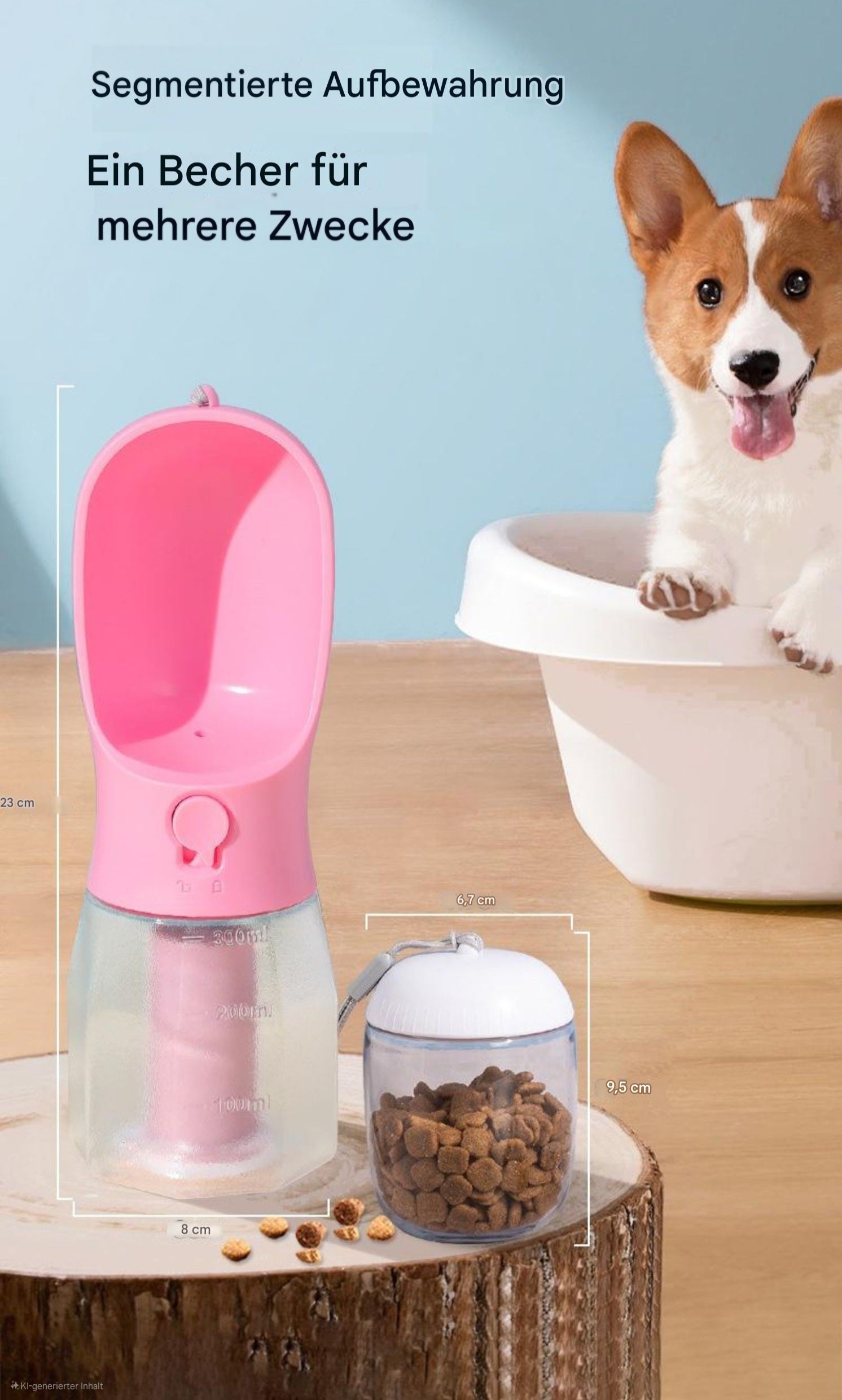 3-in-1-Design: Diese Trinkflasche für Haustiere verfügt über einen integrierten 300-ml-Wasserbehälter, einen 100-g-Futterbehälter und ein Fach für Abfallbeutel und bietet Tierbesitzern unterwegs Komfort aus einer Hand.